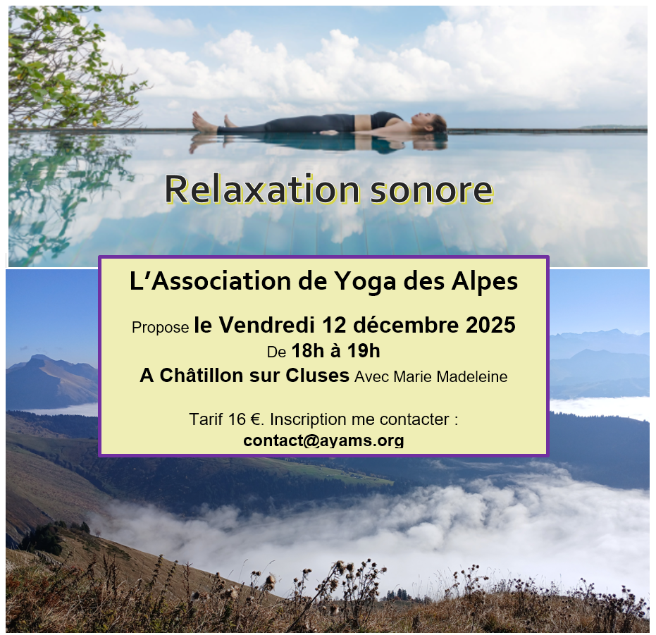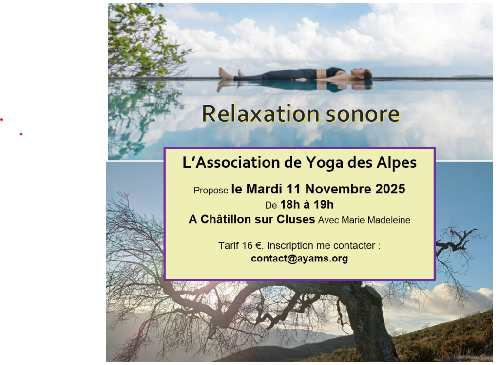 Possibilité de réserver ou d’offrir pour un groupe de 5 à 10 personnes une relaxation sonore Possibilité de participer à des cours en ligne en Yoga ou en Qi Gong ; Pour toutes infos prends contact